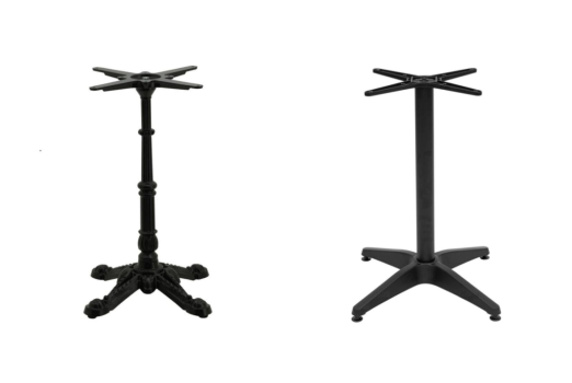 Table bases are typically made from cast iron, aluminium, or wood.